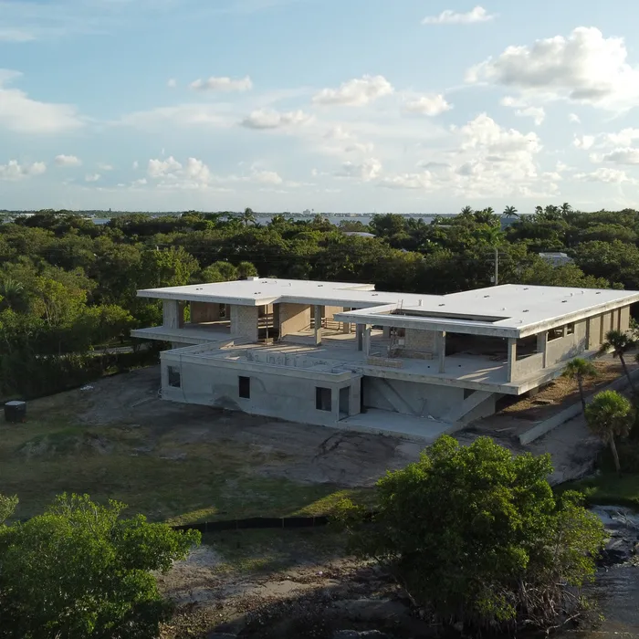 This remarkable estate represents a pinnacle of modern residential construction complexity, requiring specialized post-tensioned concrete systems to achieve the dramatic cantilevers and open floor plans that define the contemporary aesthetic while maintaining structural integrity in the waterfront environment. The aerial construction documentation reveals the massive scale of concrete work and precision engineering required for the multi-level design, including the innovative drive-through garage system and integrated pool construction that creates seamless indoor-outdoor living spaces. The combination of Sewalls Point's coveted waterfront location, substantial acreage, and the technical achievement of over 33,000 square feet of advanced concrete construction creates a residence that exemplifies modern luxury living while showcasing Shellco's expertise in executing the most complex contemporary residential projects in South Florida's premier waterfront communities.
