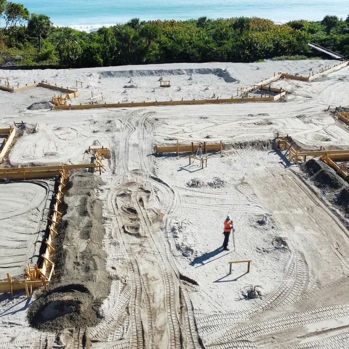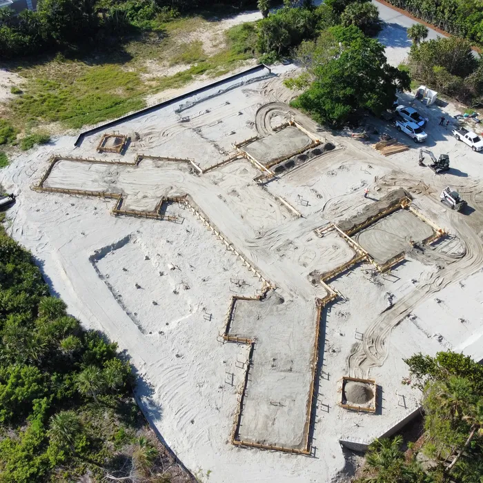 This magnificent estate encompasses seven bedrooms and eleven bathrooms across its expansive multi-wing design, strategically positioned to maximize panoramic ocean views and pristine beachfront access. The aerial construction documentation reveals the impressive scale and technical complexity, showcasing multiple building sections connected by covered walkways and courtyards, all built directly on crystal-clear oceanfront property. The project required precise coordination of foundation work, concrete placement, and framing systems while managing the logistical challenges of beachfront construction, including material delivery and environmental considerations for this sensitive coastal location