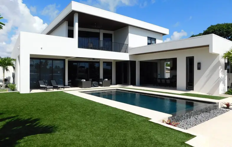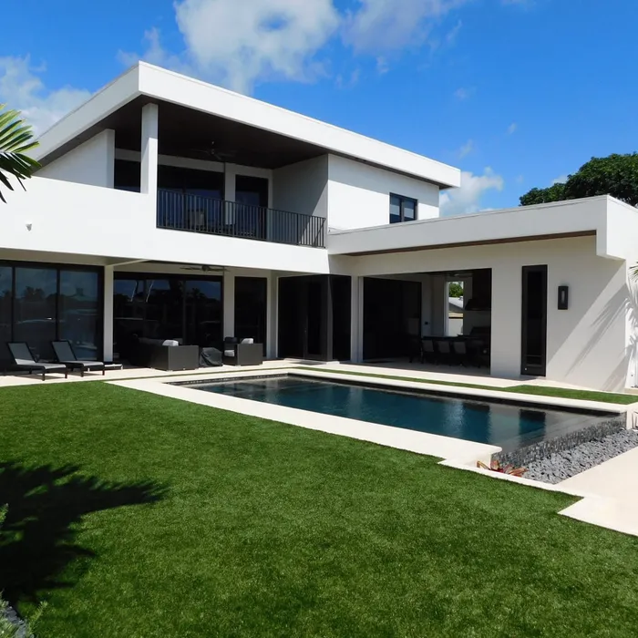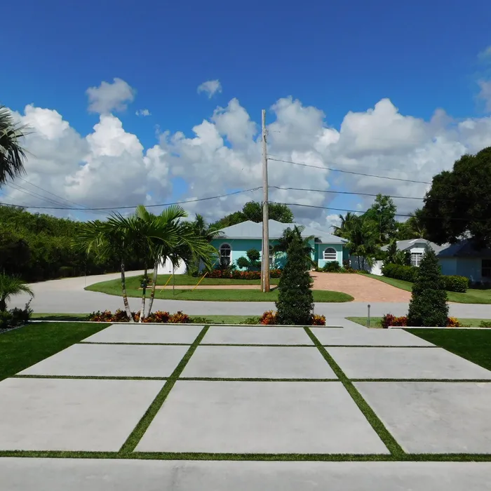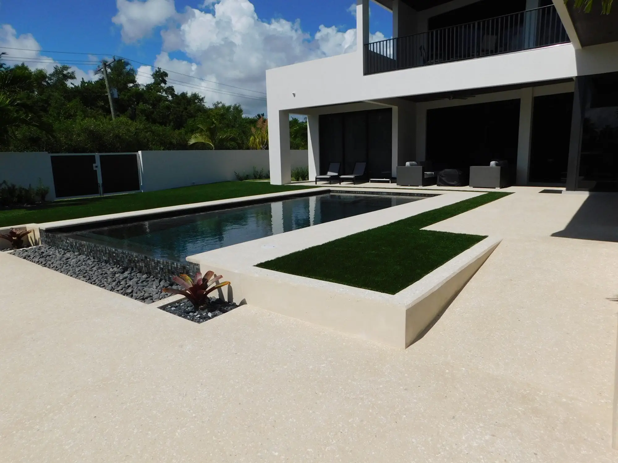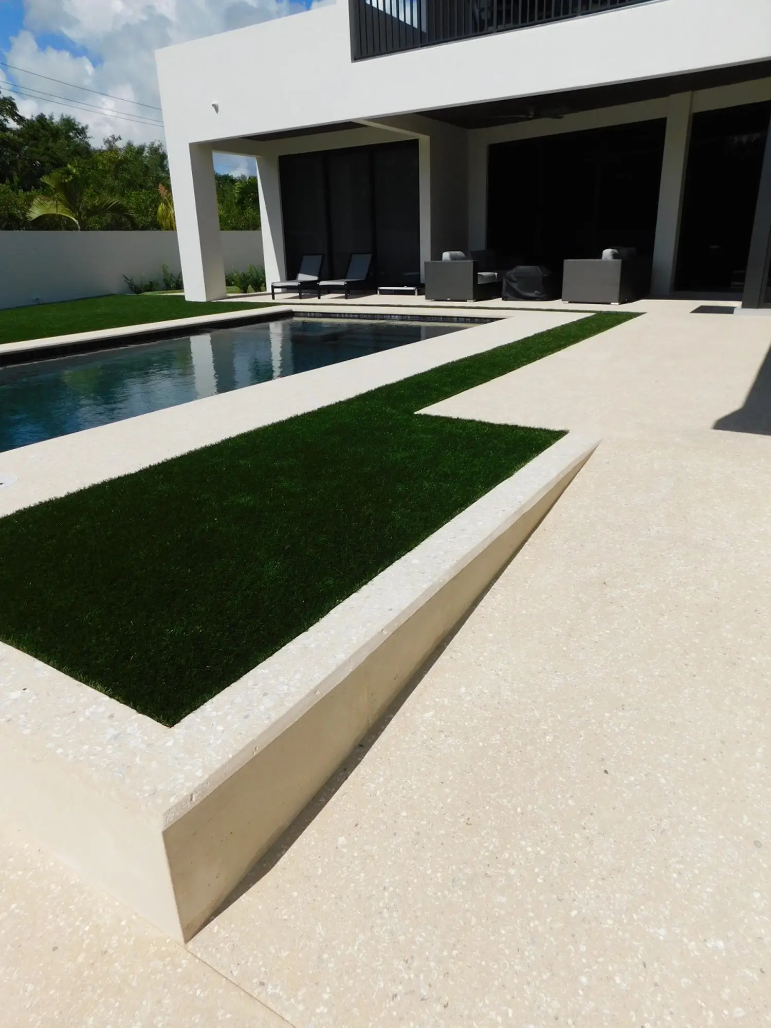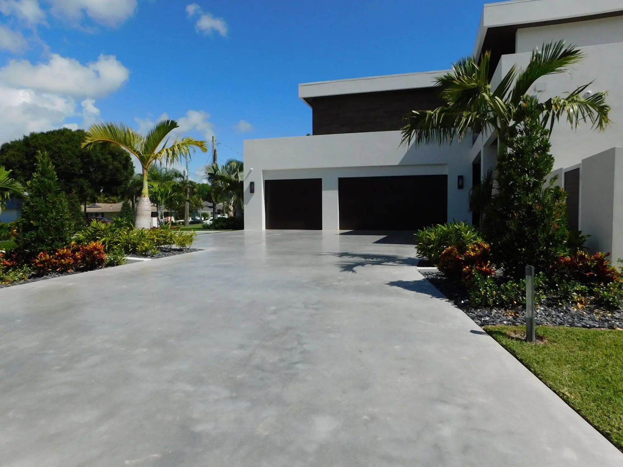 Shellco Construction provided comprehensive shell work and specialty concrete services for this 7,000 square foot Palm Beach Gardens residence, delivering a diverse range of high-end concrete applications that showcase advanced finishing techniques and custom craftsmanship. The project featured polished standard gray concrete for the front driveway, Mesa Beige tabby concrete pool deck with honed surface and light sandblasting for slip resistance, hand-formed concrete stair treads with black pigment, and exposed concrete walls with precision tool joint finishes that demonstrate Shellco's mastery of both functional and decorative concrete applications.