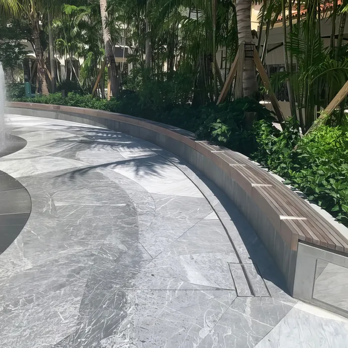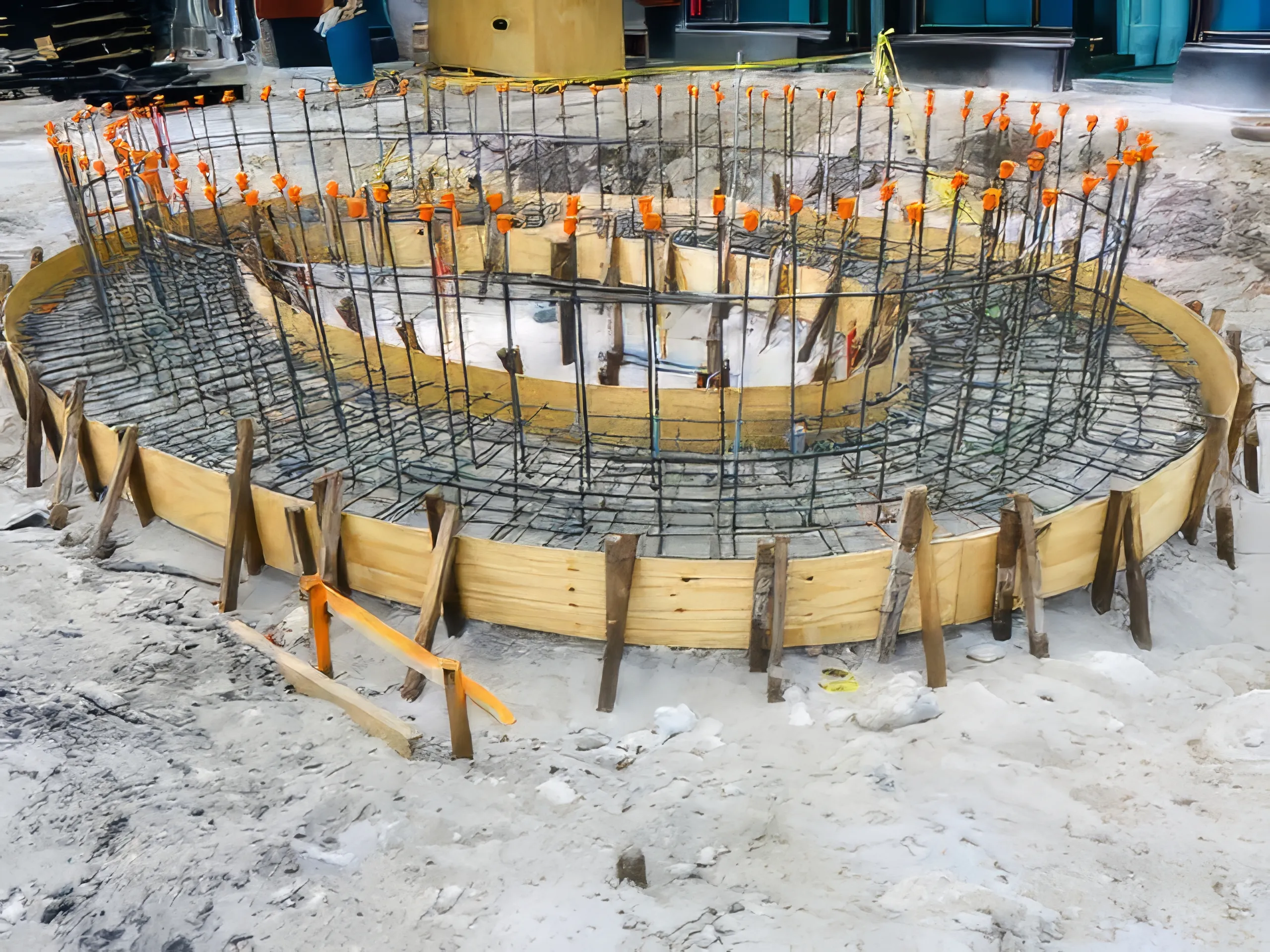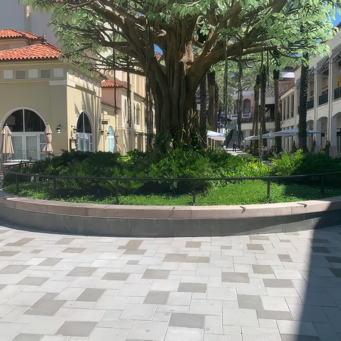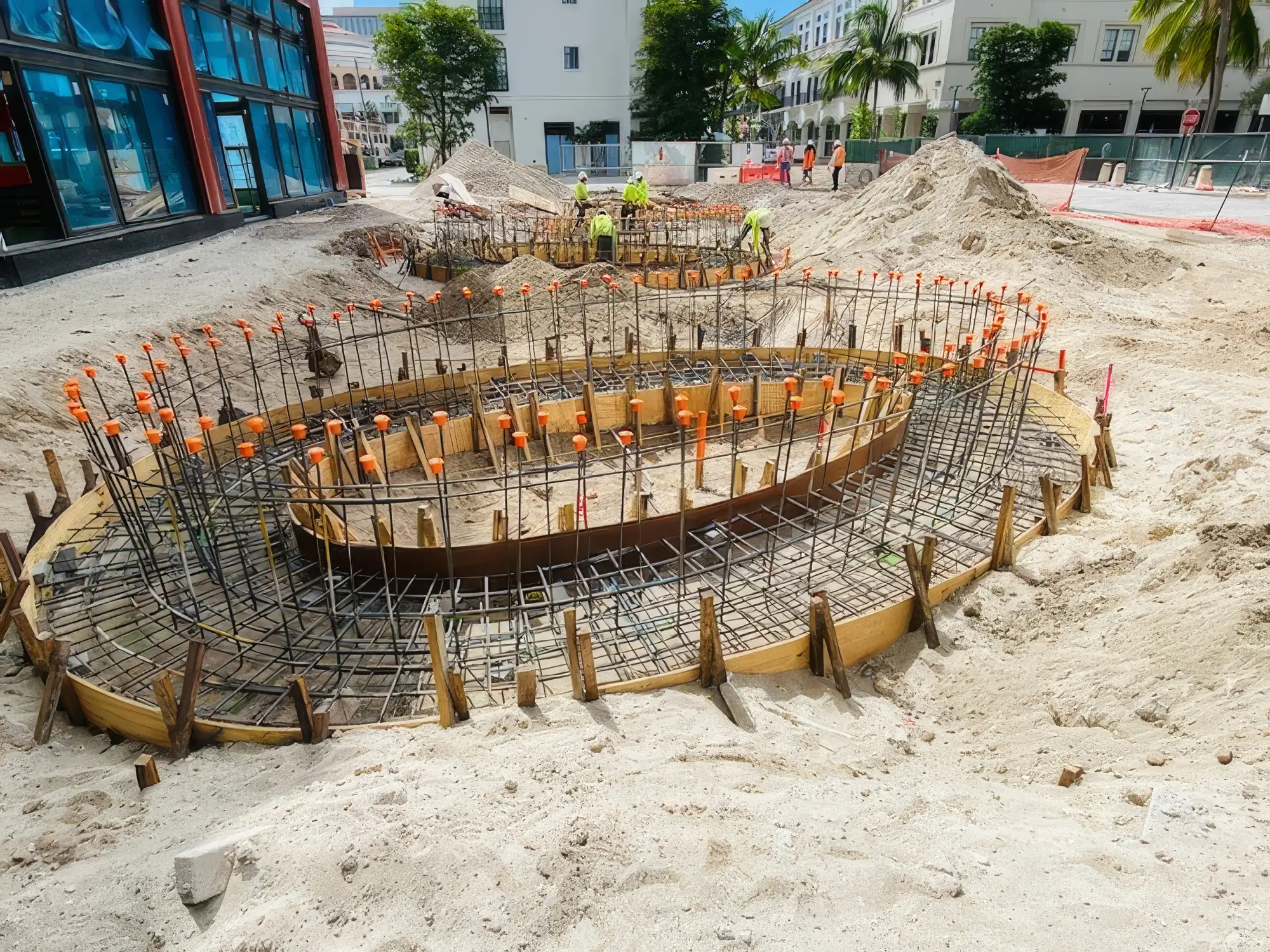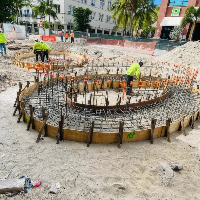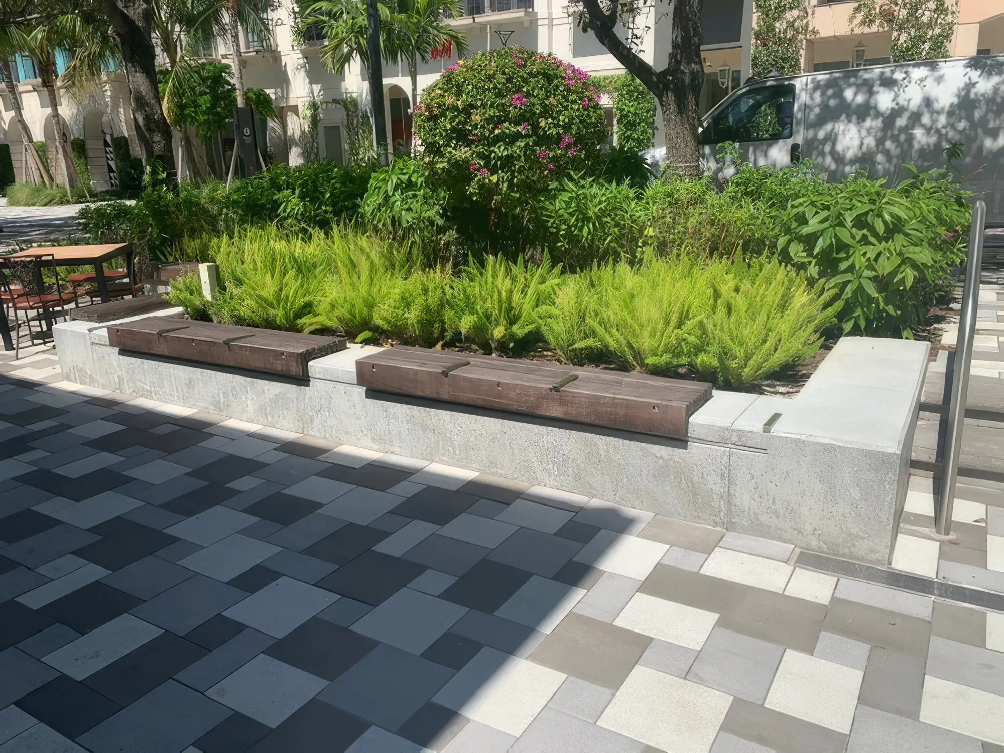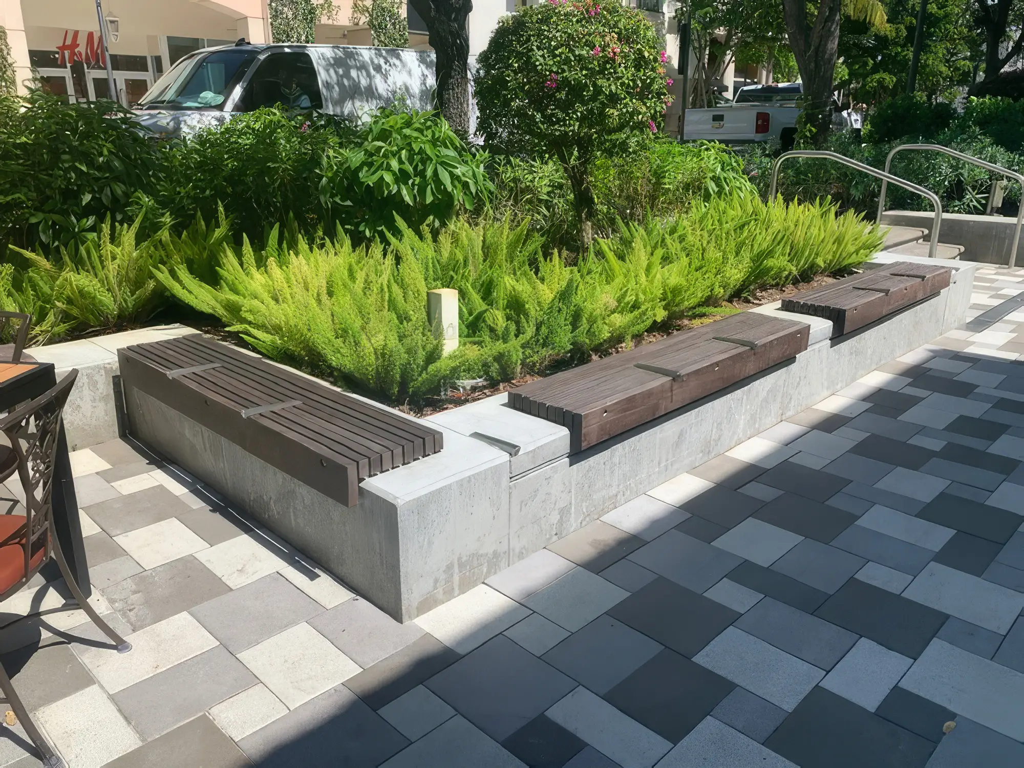 Shellco Construction delivered custom-designed concrete benches for Rosemary Square, featuring multiple shaped configurations that function as both seating and raised planters in this vibrant public space. The project required forming and advanced concrete work to create the complex curved and angular shapes, topped with polished gray concrete surfaces and integral teak wood seating elements for comfort and visual warmth.