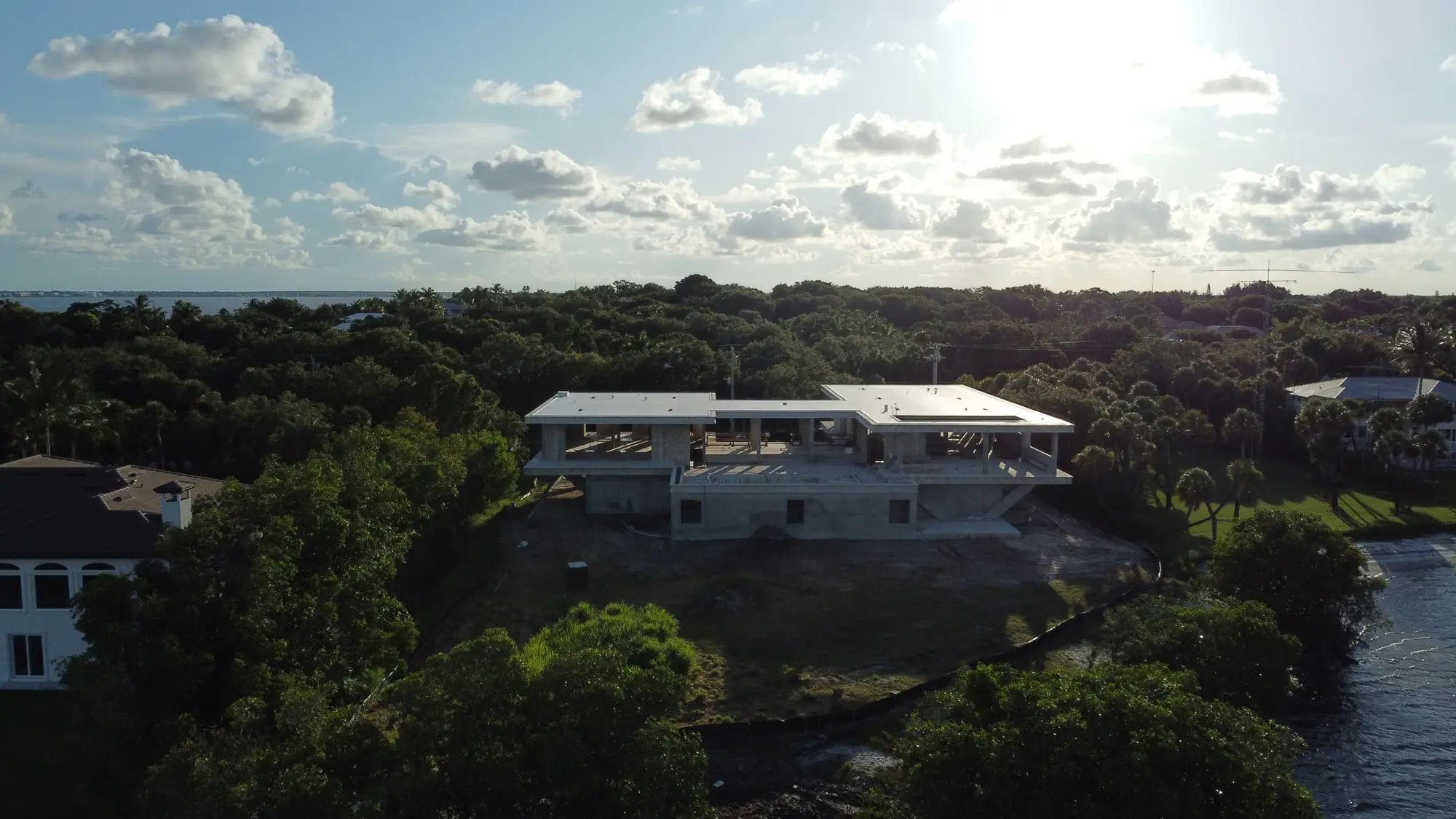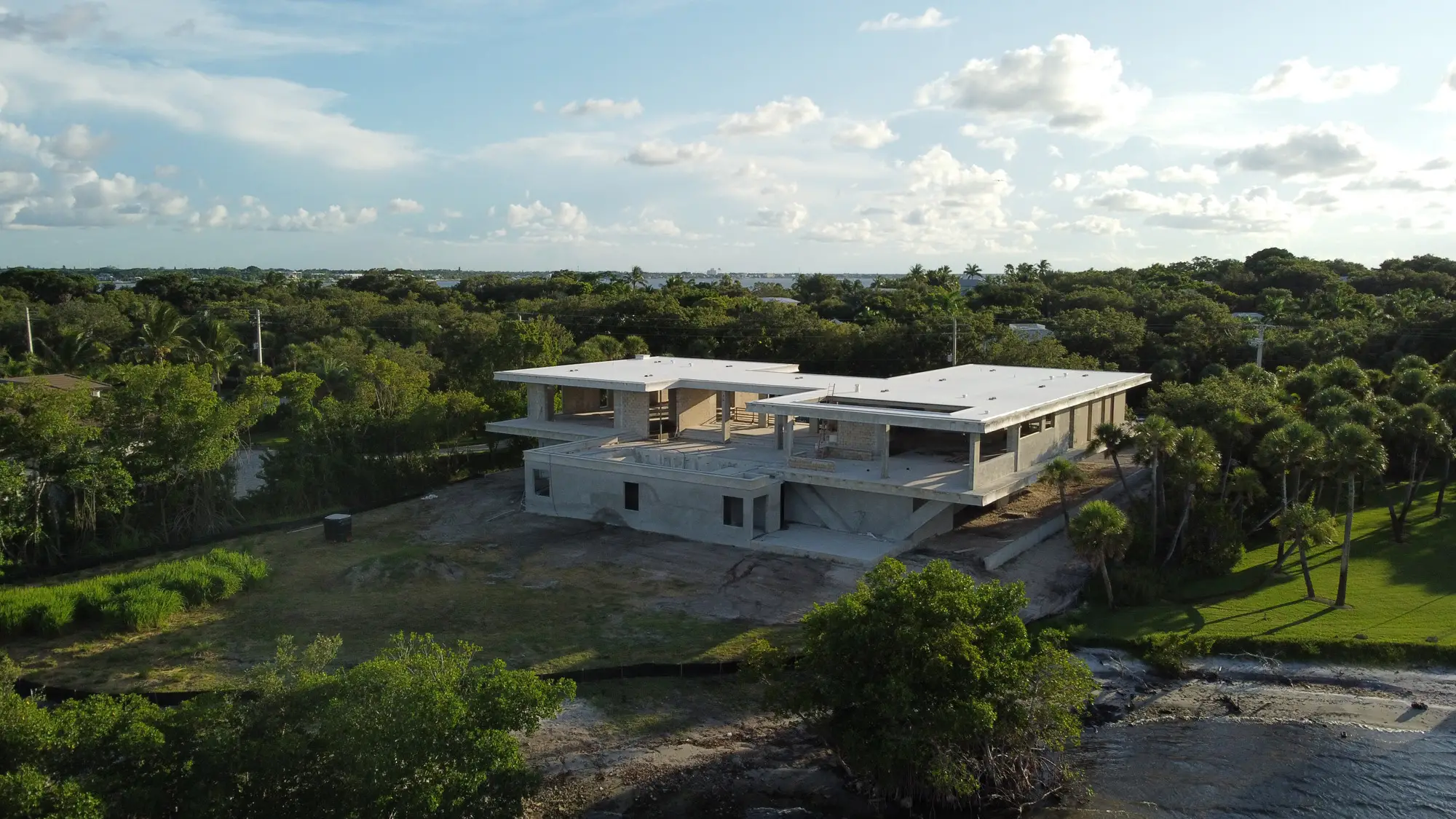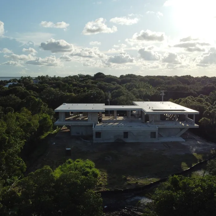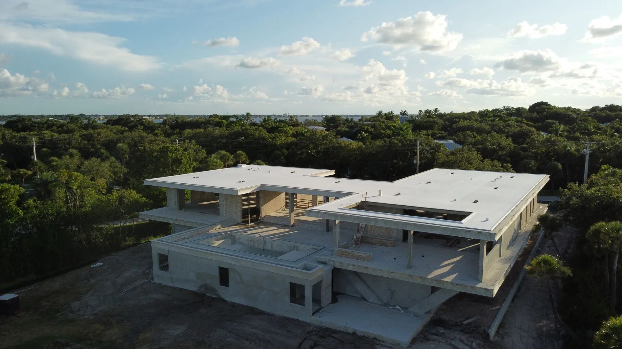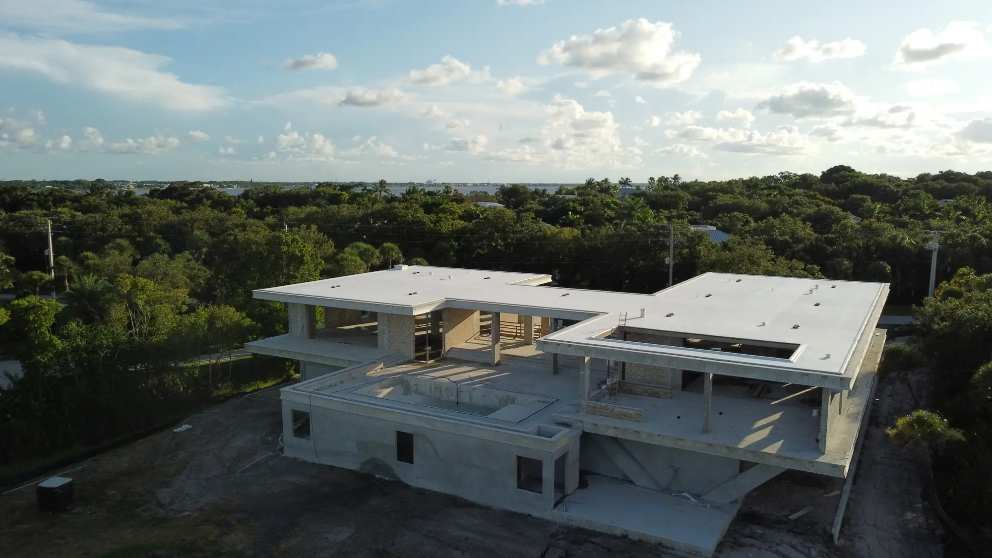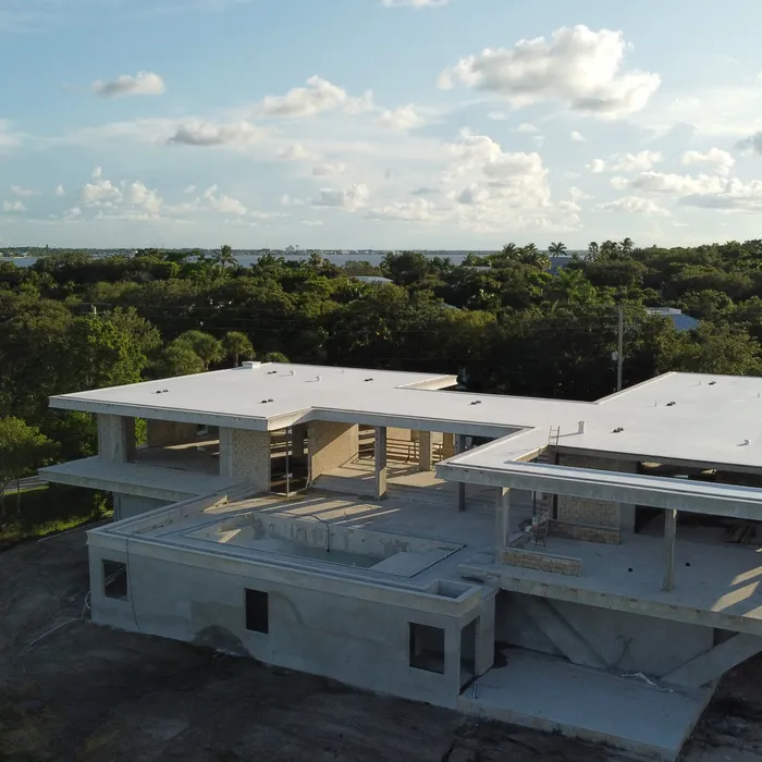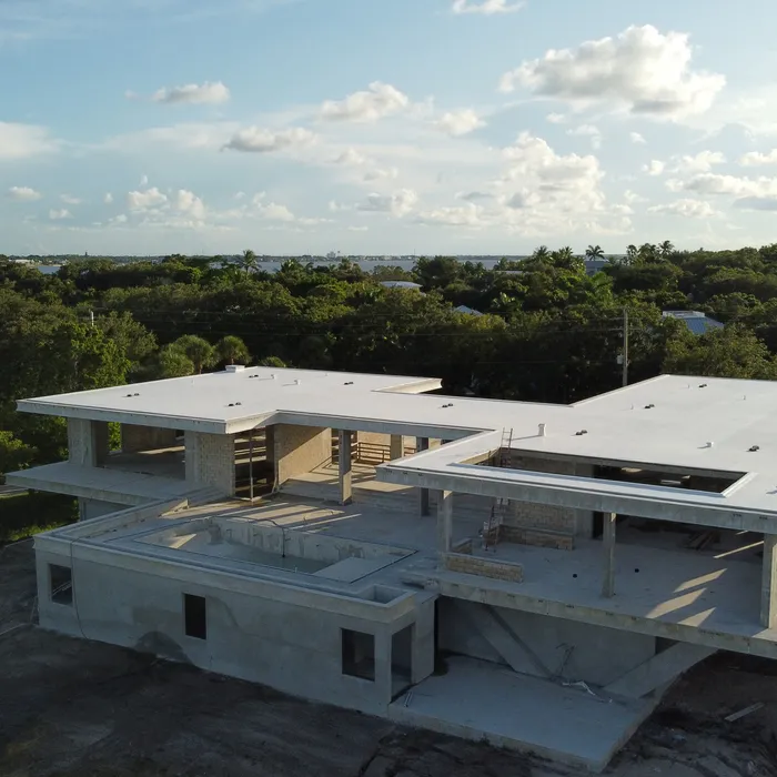This remarkable estate represents a pinnacle of modern residential construction complexity, requiring specialized post-tensioned concrete systems to achieve the dramatic cantilevers and open floor plans that define the contemporary aesthetic while maintaining structural integrity in the waterfront environment. The aerial construction documentation reveals the massive scale of concrete work and precision engineering required for the multi-level design, including the innovative drive-through garage system and integrated pool construction that creates seamless indoor-outdoor living spaces. The combination of Sewalls Point's coveted waterfront location, substantial acreage, and the technical achievement of over 33,000 square feet of advanced concrete construction creates a residence that exemplifies modern luxury living while showcasing Shellco's expertise in executing the most complex contemporary residential projects in South Florida's premier waterfront communities.