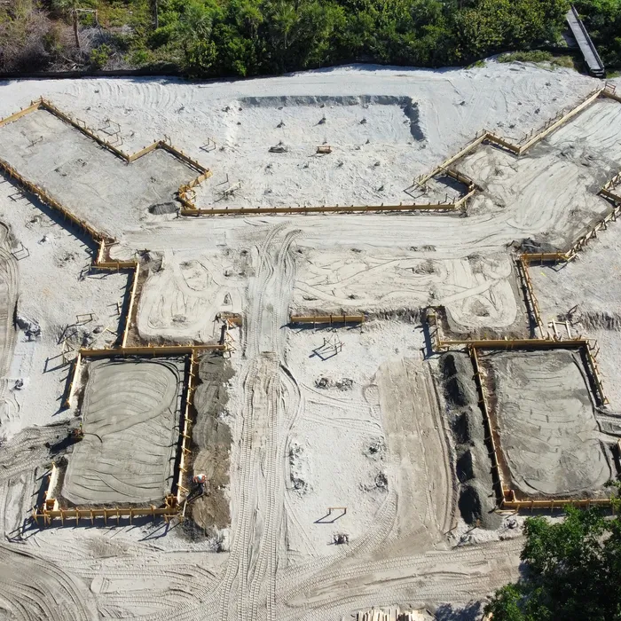 This magnificent estate encompasses seven bedrooms and eleven bathrooms across its expansive multi-wing design, strategically positioned to maximize panoramic ocean views and pristine beachfront access. The aerial construction documentation reveals the impressive scale and technical complexity, showcasing multiple building sections connected by covered walkways and courtyards, all built directly on crystal-clear oceanfront property. The project required precise coordination of foundation work, concrete placement, and framing systems while managing the logistical challenges of beachfront construction, including material delivery and environmental considerations for this sensitive coastal location