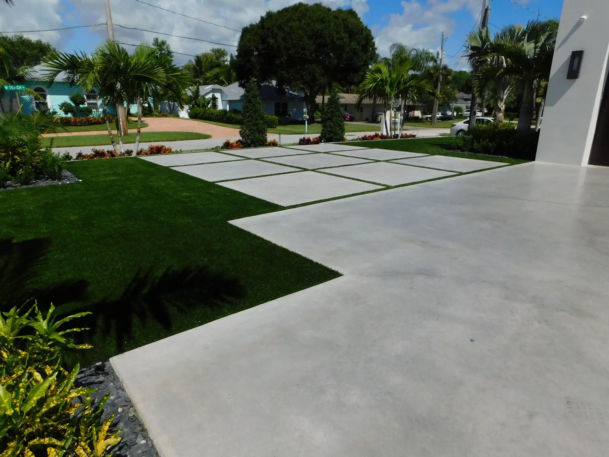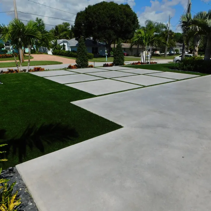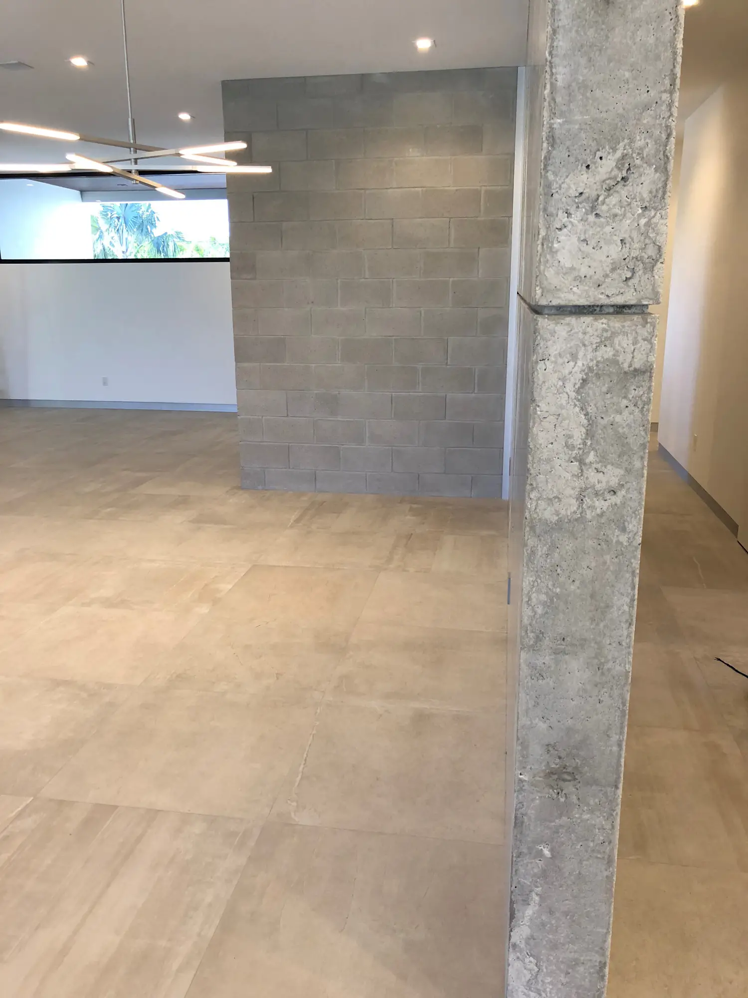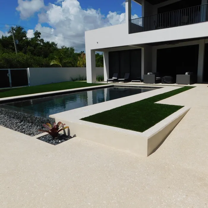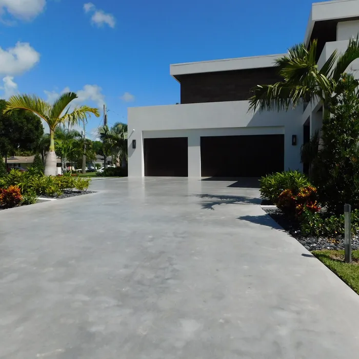 Shellco Construction provided comprehensive shell work and specialty concrete services for this 7,000 square foot Palm Beach Gardens residence, delivering a diverse range of high-end concrete applications that showcase advanced finishing techniques and custom craftsmanship. The project featured polished standard gray concrete for the front driveway, Mesa Beige tabby concrete pool deck with honed surface and light sandblasting for slip resistance, hand-formed concrete stair treads with black pigment, and exposed concrete walls with precision tool joint finishes that demonstrate Shellco's mastery of both functional and decorative concrete applications.