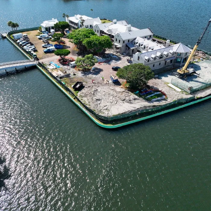 This exclusive 2.3-acre island property features the area's only private lighted tennis courts, two swimming pools, including a 98-foot lakefront infinity pool, 11 bedrooms, two full kitchens, and lake views on all sides. Construction required a specialized auger pile spread footing foundation engineered for island conditions, with all materials transported by barge due to the property's unique bridge and boat-only access. The project showcased Shellco's expertise in complex waterfront construction, seamlessly integrating modern luxury amenities with historic architecture while meeting hurricane-zone requirements.