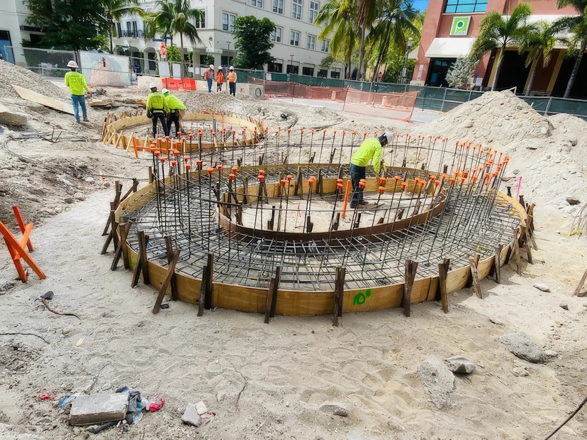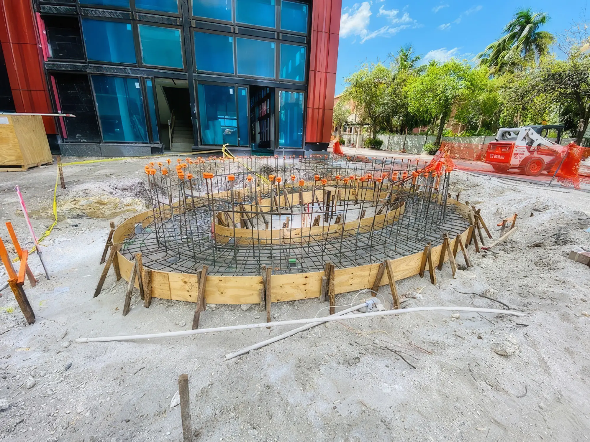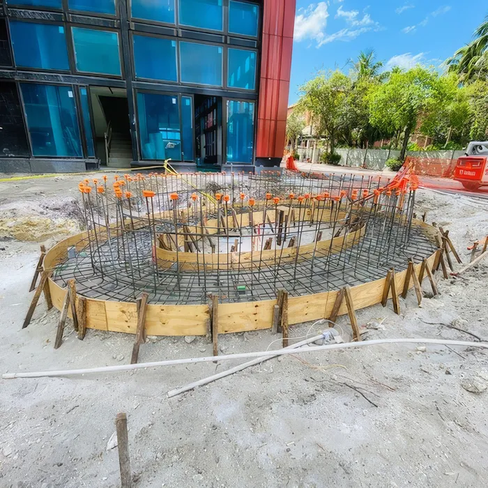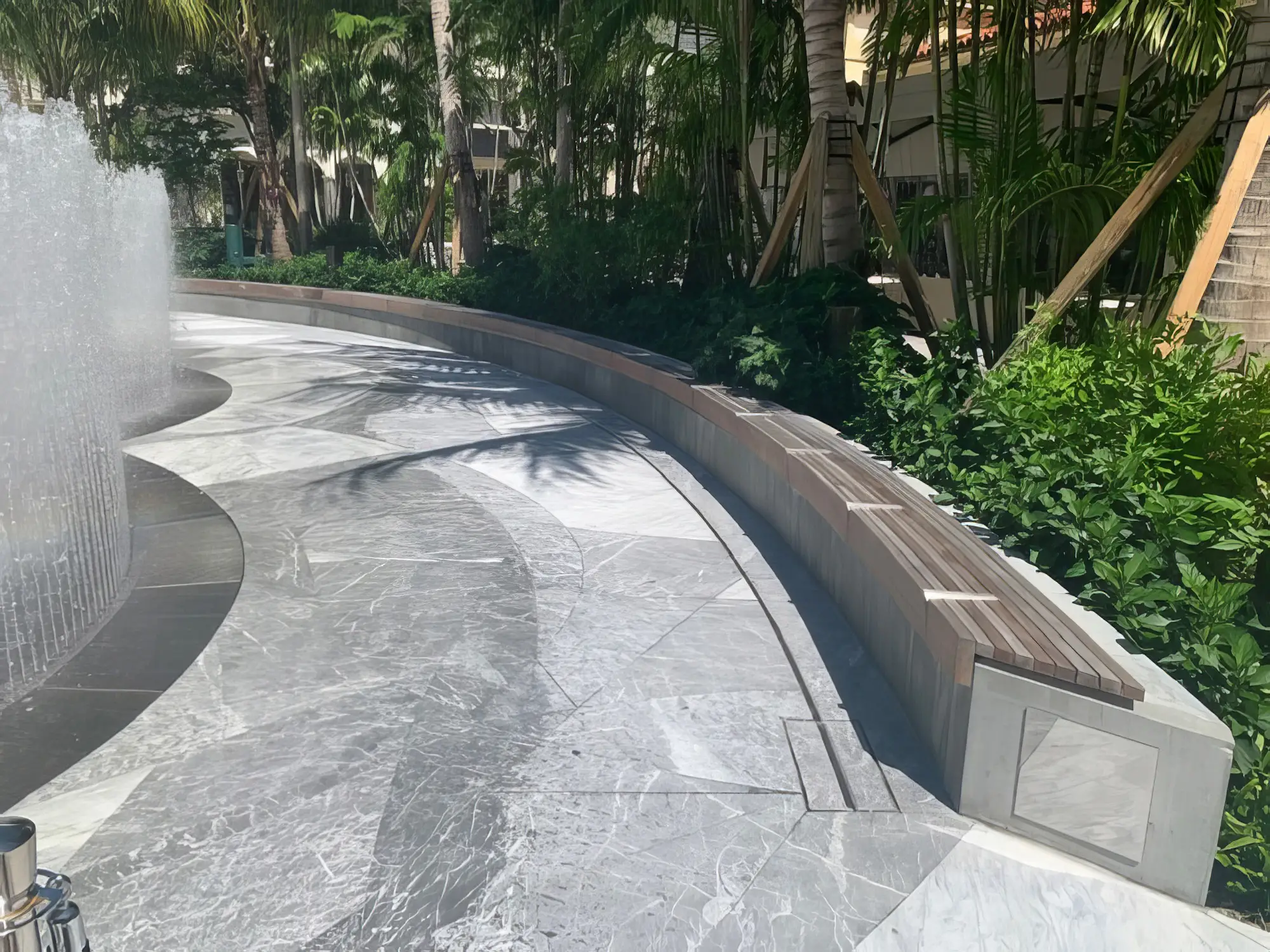 Shellco Construction delivered custom-designed concrete benches for Rosemary Square, featuring multiple shaped configurations that function as both seating and raised planters in this vibrant public space. The project required forming and advanced concrete work to create the complex curved and angular shapes, topped with polished gray concrete surfaces and integral teak wood seating elements for comfort and visual warmth.
