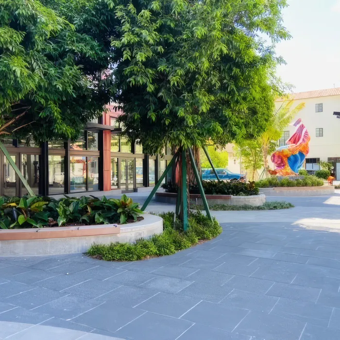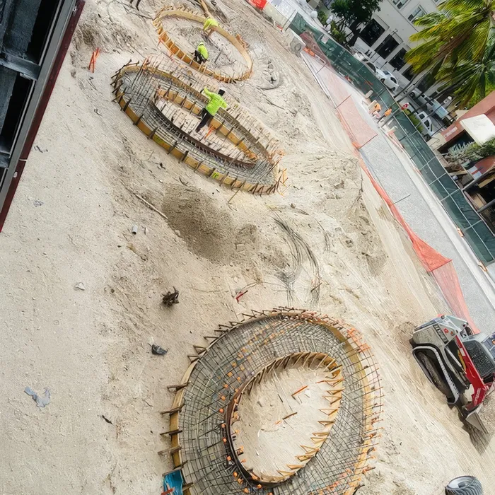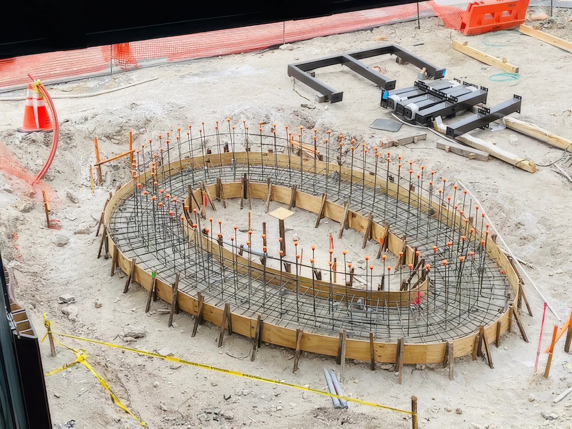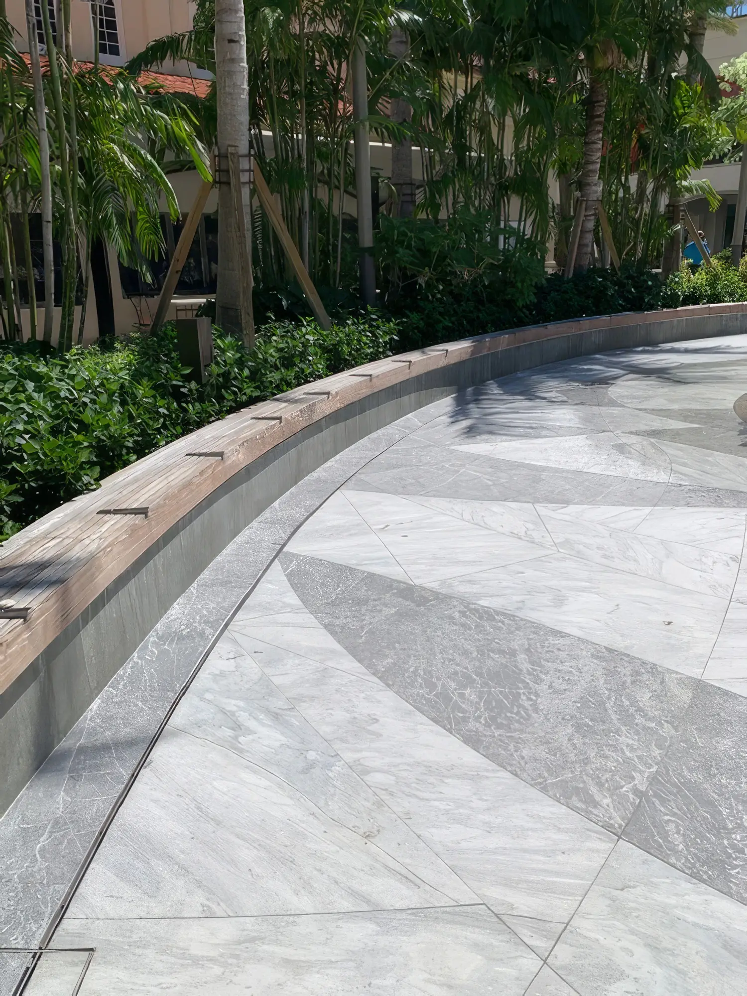 Shellco Construction delivered custom-designed concrete benches for Rosemary Square, featuring multiple shaped configurations that function as both seating and raised planters in this vibrant public space. The project required forming and advanced concrete work to create the complex curved and angular shapes, topped with polished gray concrete surfaces and integral teak wood seating elements for comfort and visual warmth.