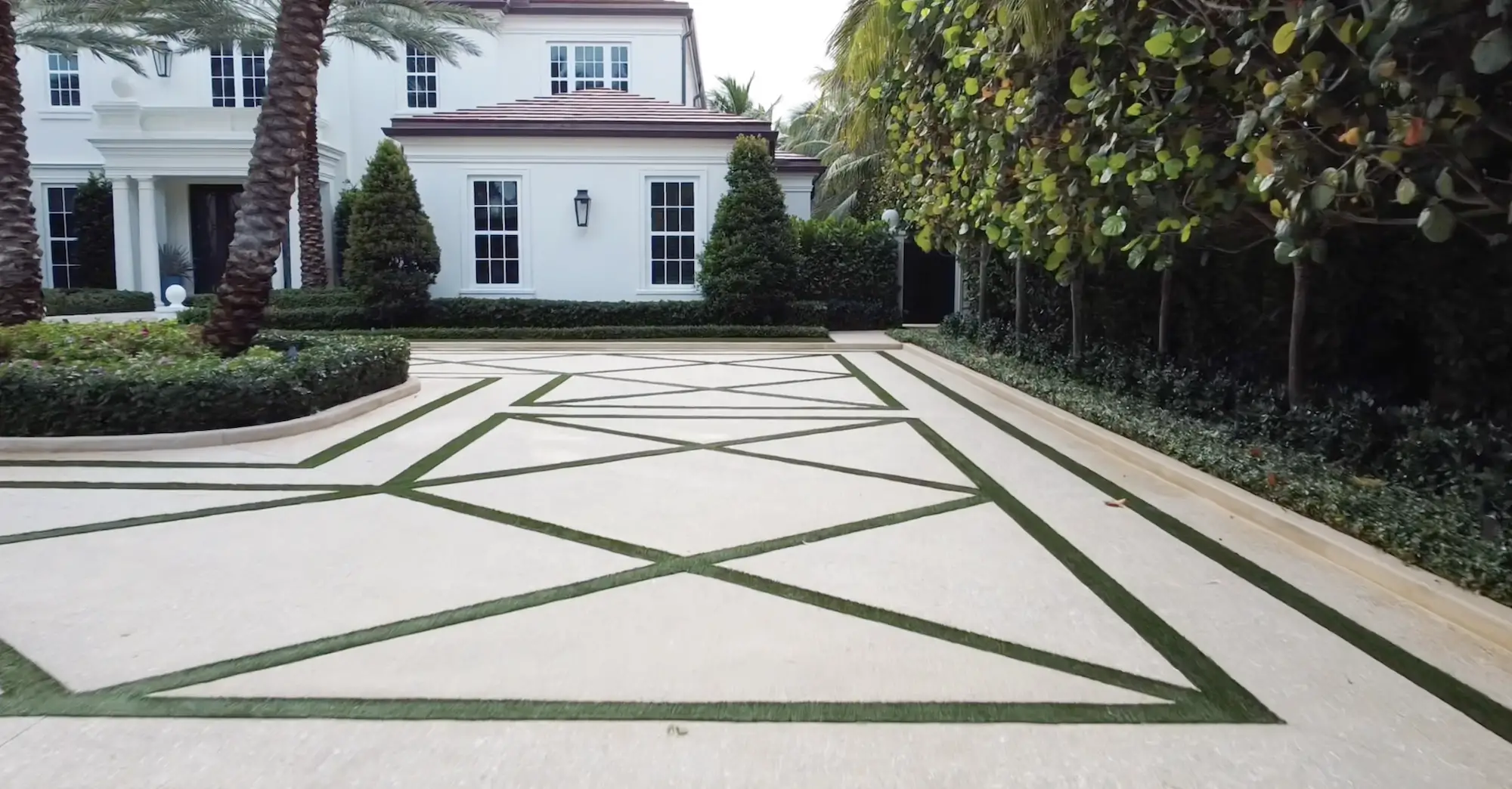 Shellco Construction delivered an exceptional 9,862 square foot diamond pattern tabby driveway for this prestigious oceanfront manor, featuring Beach Beige Tabby concrete with #3 Coquina Shell aggregate and a precision sandblasted finish that creates both stunning visual impact and optimal surface texture. The project showcased advanced decorative concrete techniques through the execution of intricate geometric diamond patterns that required precise forming, careful aggregate placement, and skilled sandblasting to achieve the sophisticated finish that complements the estate's classical architecture.